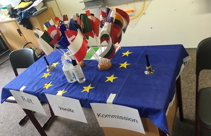 Zwei Schüler/Innen übernahmen daher jeweils in einer Gruppe die Rolle als Vorsitzende des Gipfels und die anderen 14 Schüler/Innen jeweils die Rollen der Staats- und Regierungschefs von einzelnen Mitgliedstaaten.